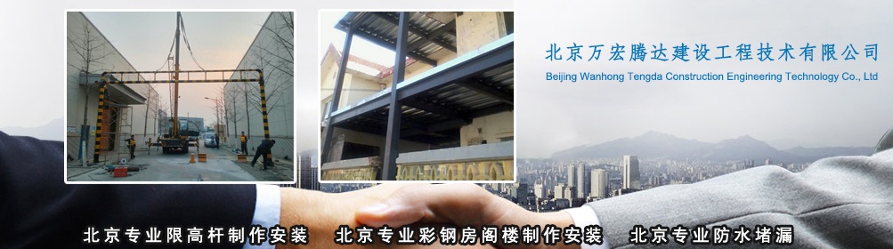 歡迎各界朋友,歡迎您訪問北京萬宏騰達建設工程技術有限公司網站(www.bjwhdjz_com.shanmoshi.com.cn),北京萬宏騰達建設工程技術有限公司專業從事高中低檔限高桿制作安裝,專業承接工程、家庭學校醫院彩鋼房閣樓制作安裝,專業防水堵漏,專業劃車位線,24小時咨詢電話:1367125  更多